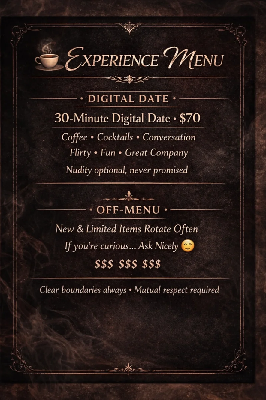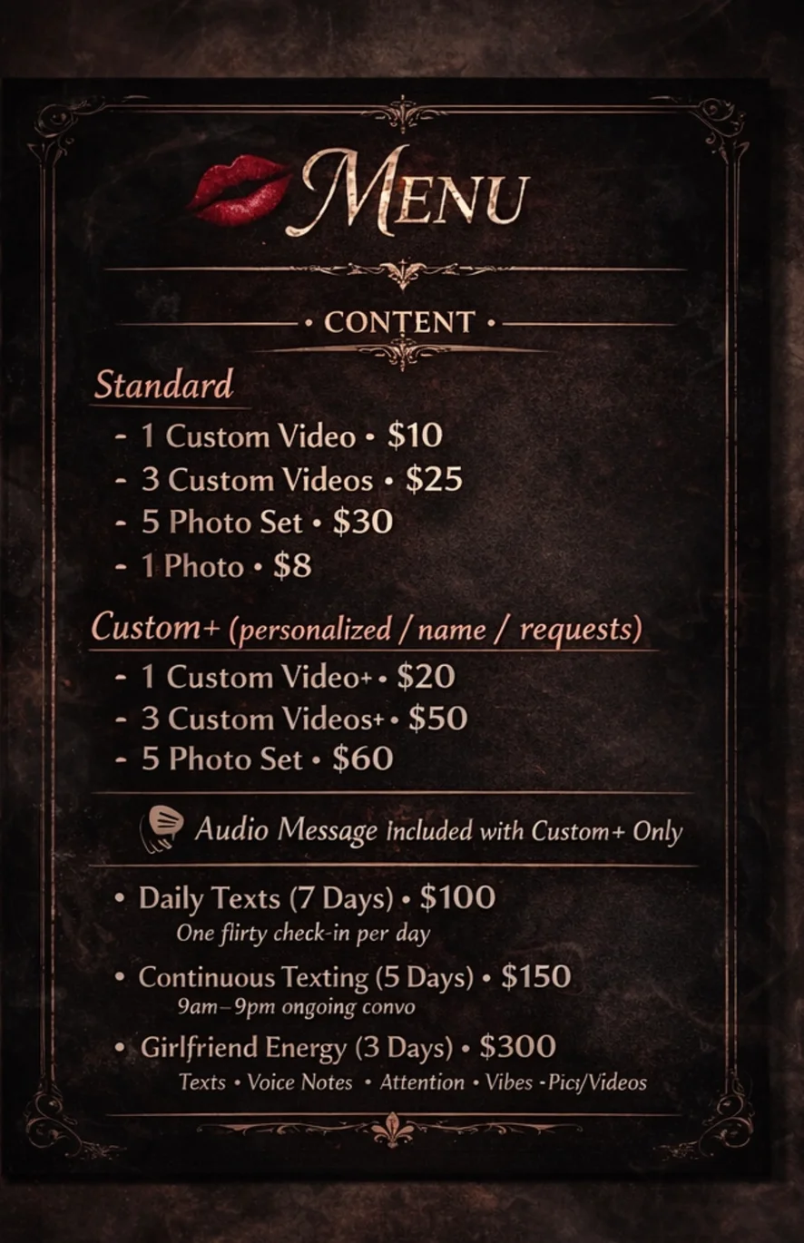 Дилдо или вибратор, Грязные разговоры, Эротические танцы, Засвет, Шлепки, Стриптиз, Йога, Рейтинг члена, Камшот, Глубокая глотка, Сидение на лице, Фут-фетиш, Кляп, Каблуки, Унижение, Мастурбация, Оргазм, Ролевые игры, Глотание спермы, Свинг, Топлесс, Минет, Буккакэ, Верблюжья лапка, Кулинария, Кримпай, Кончить на лицо, Мастурбация пальцами, Шоу с маслом, Вне дома, Пеггинг, Секс-игрушки, Курение, Сквирт, Под юбкой, Поза "69"